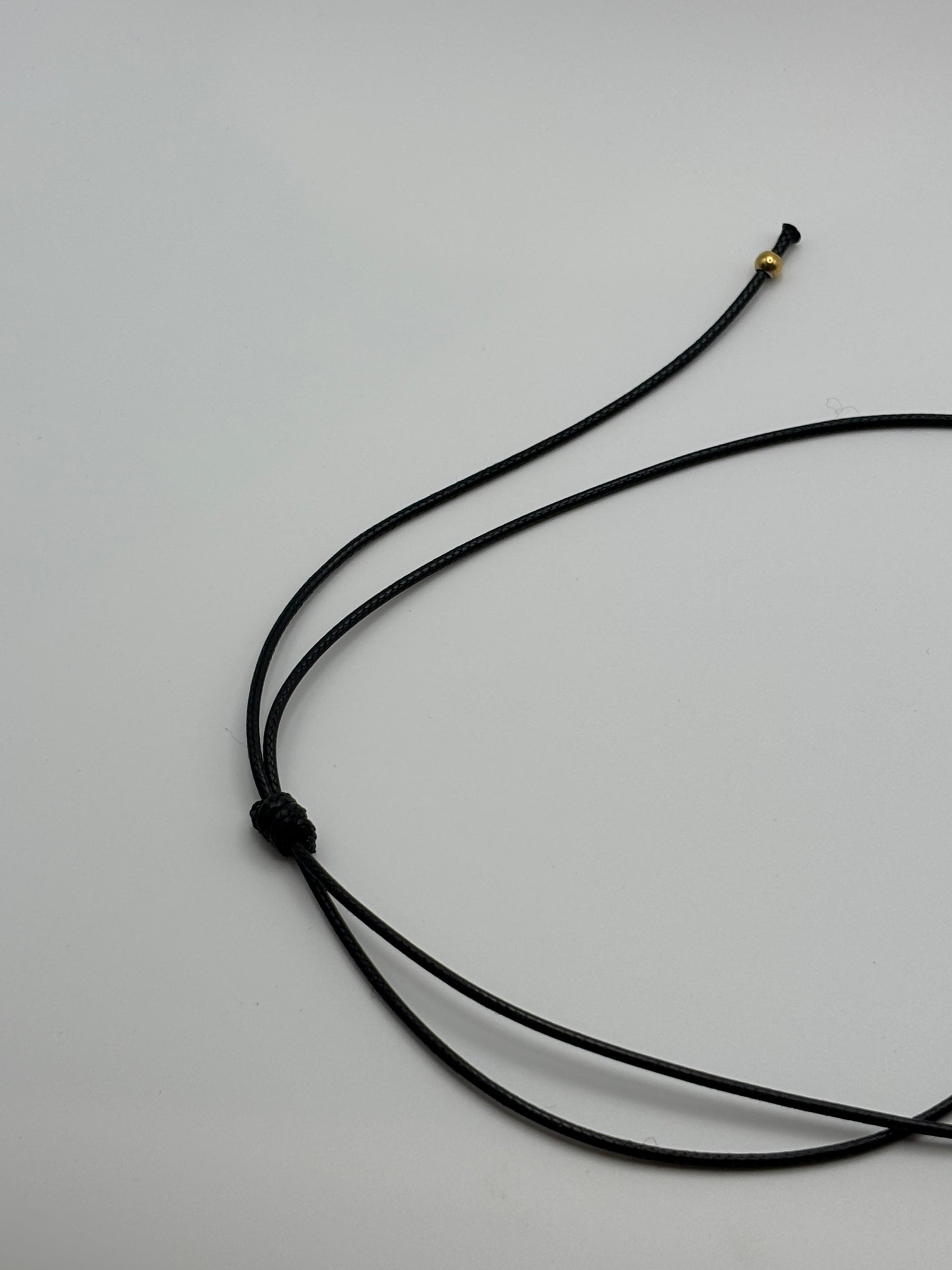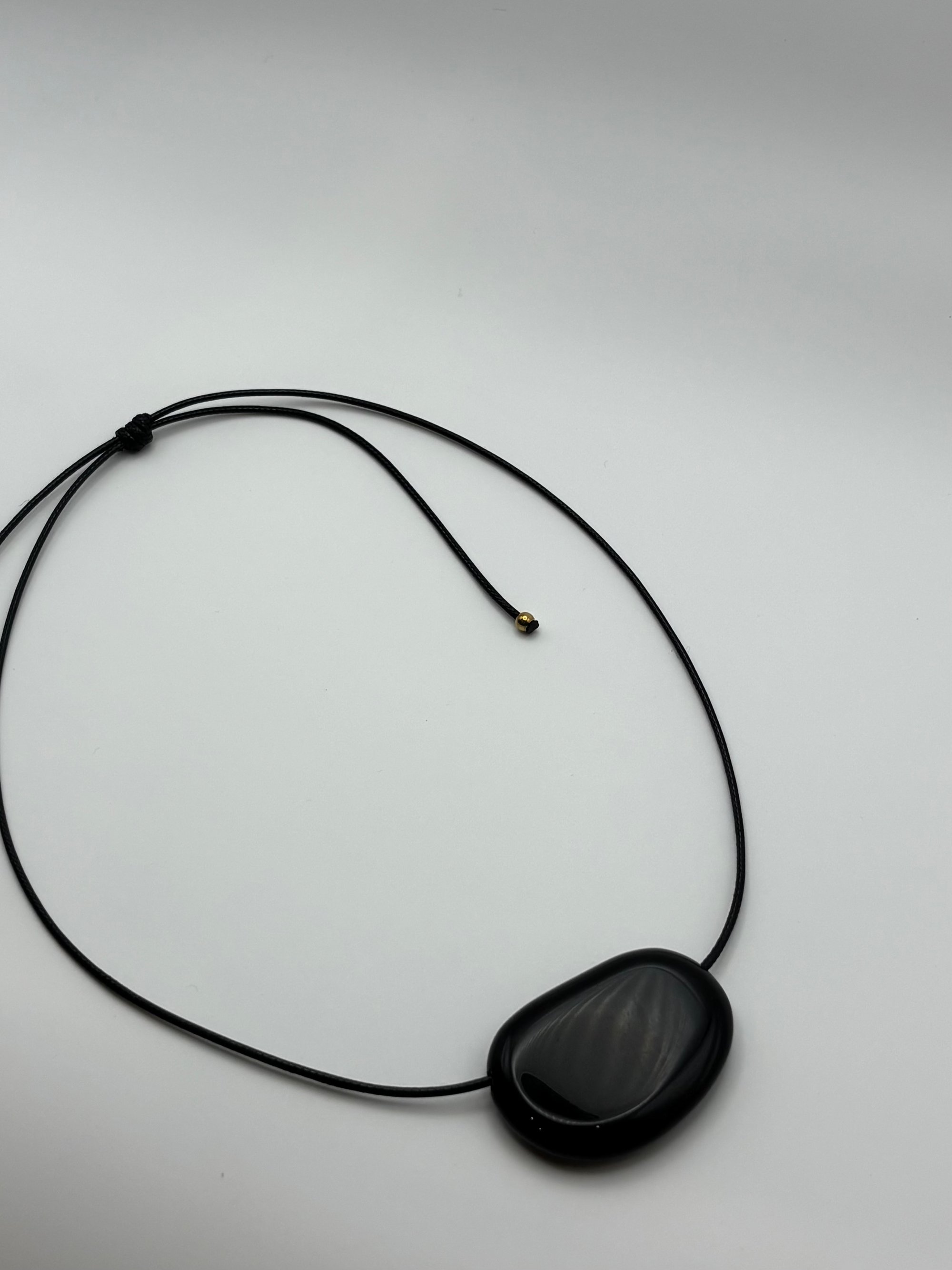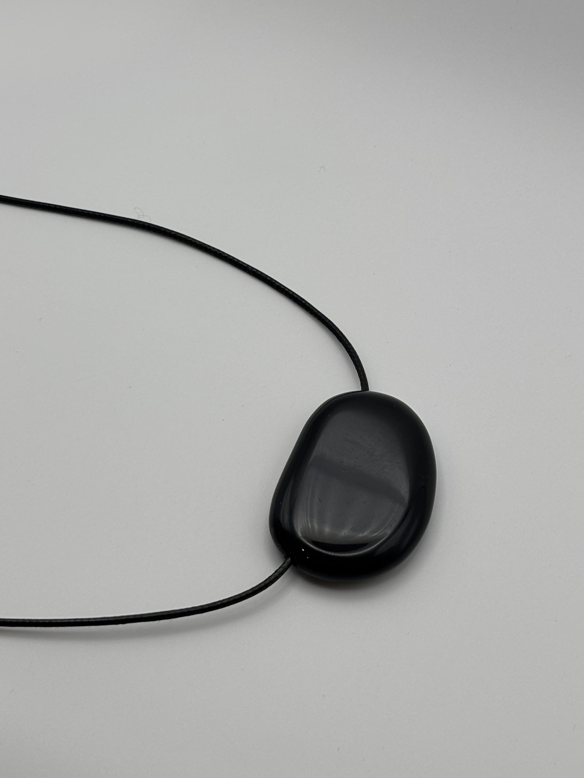 - Smooth, pebble-shaped black pendant on a sleek black cord
