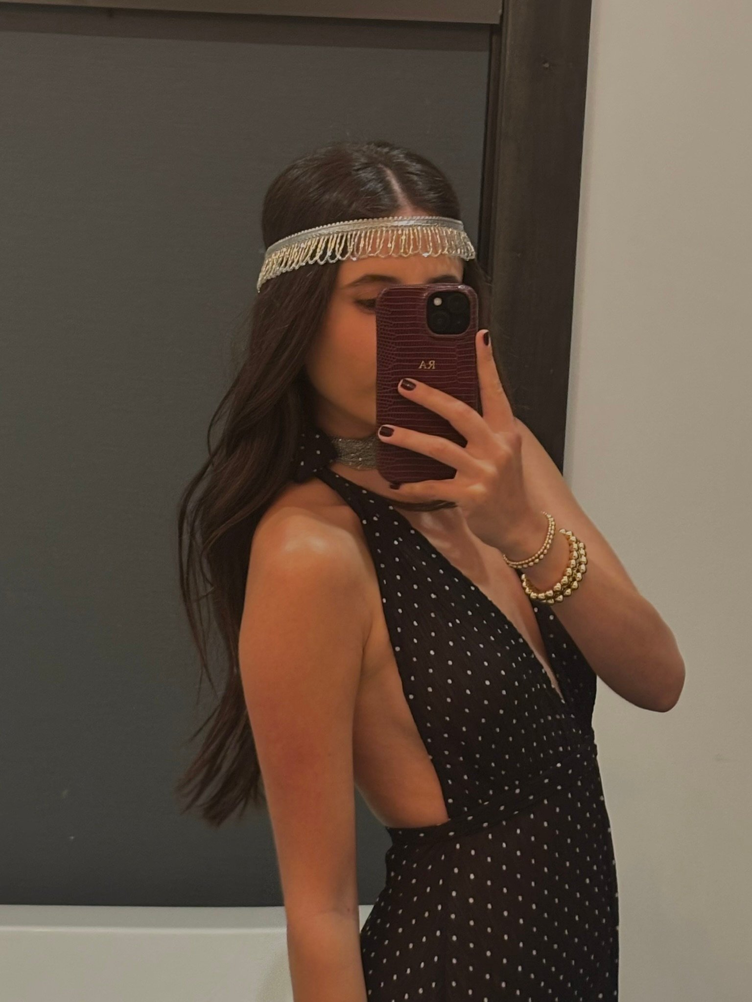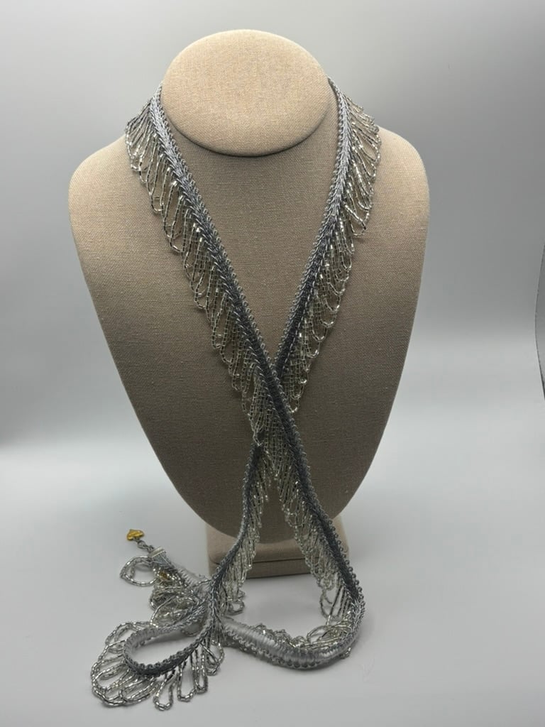 - Hand-woven silver thread necklace with cascading glass-bead fringe