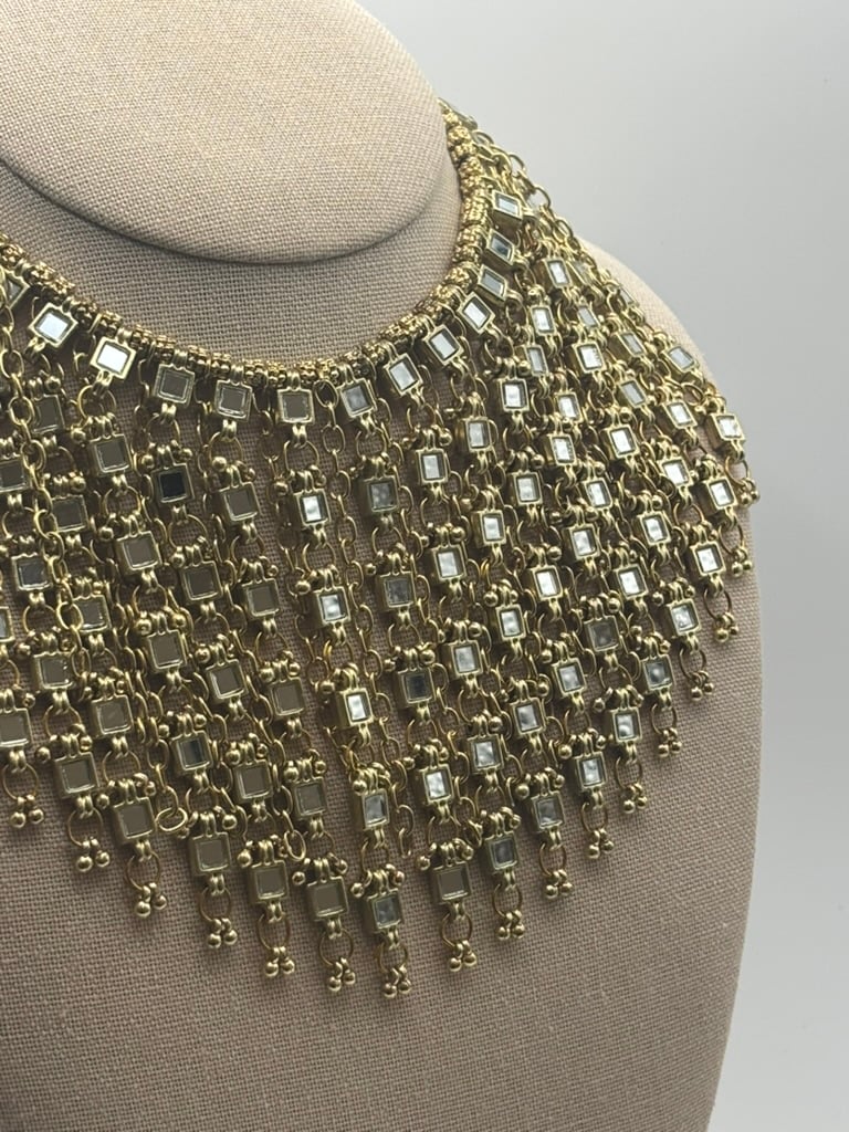 - Gold-plated brass necklace with cascading hand-set mirrored accents