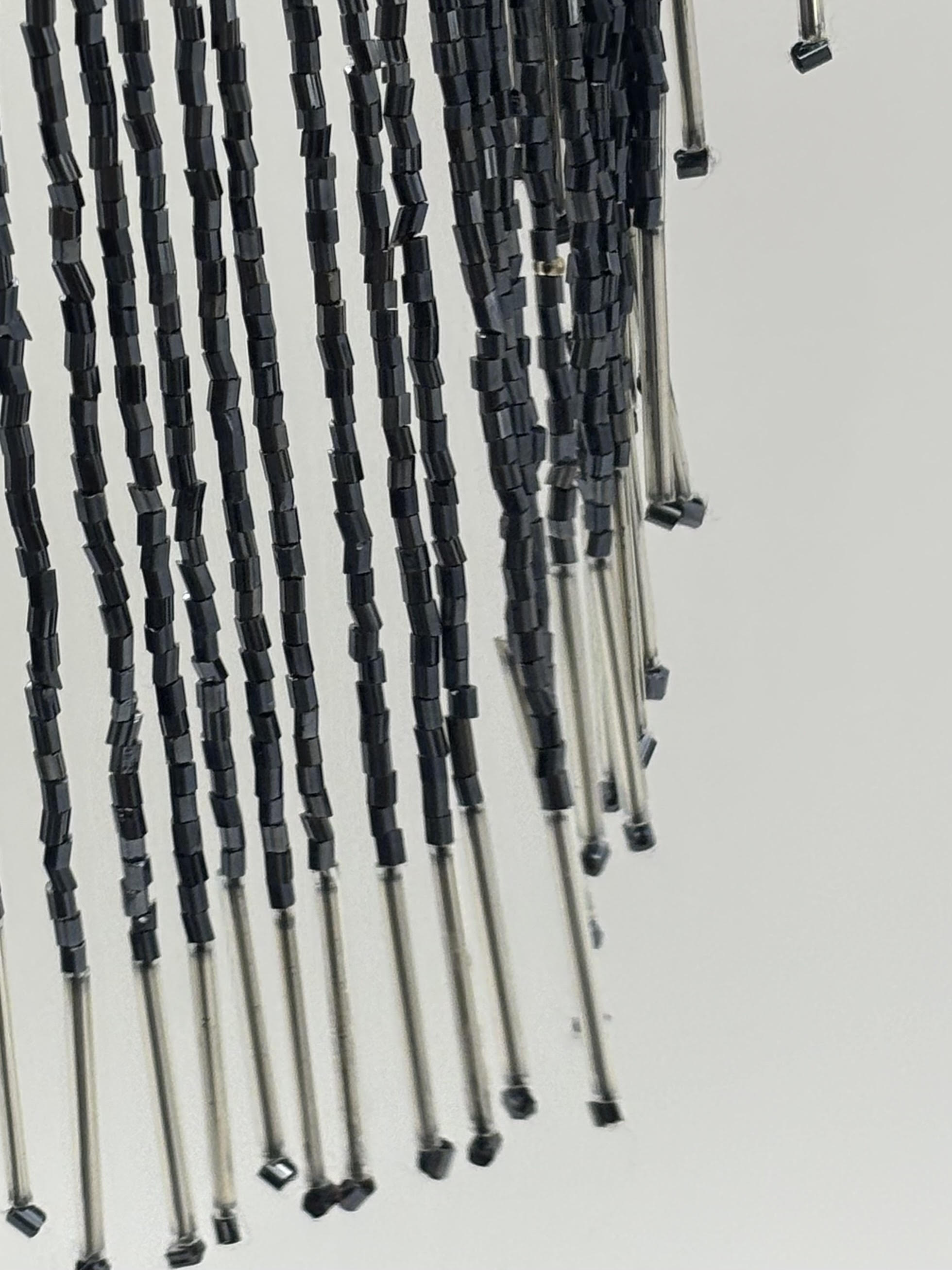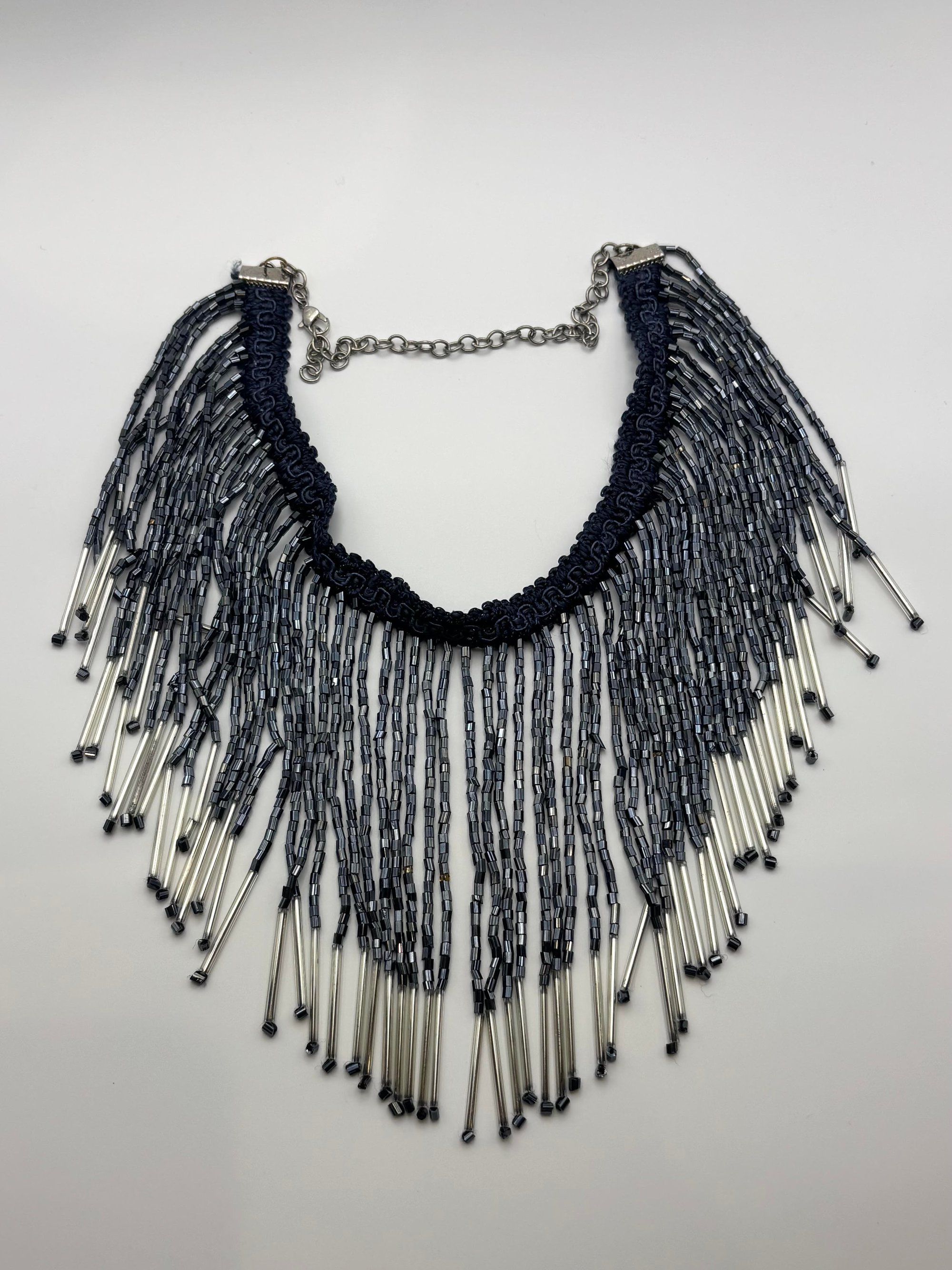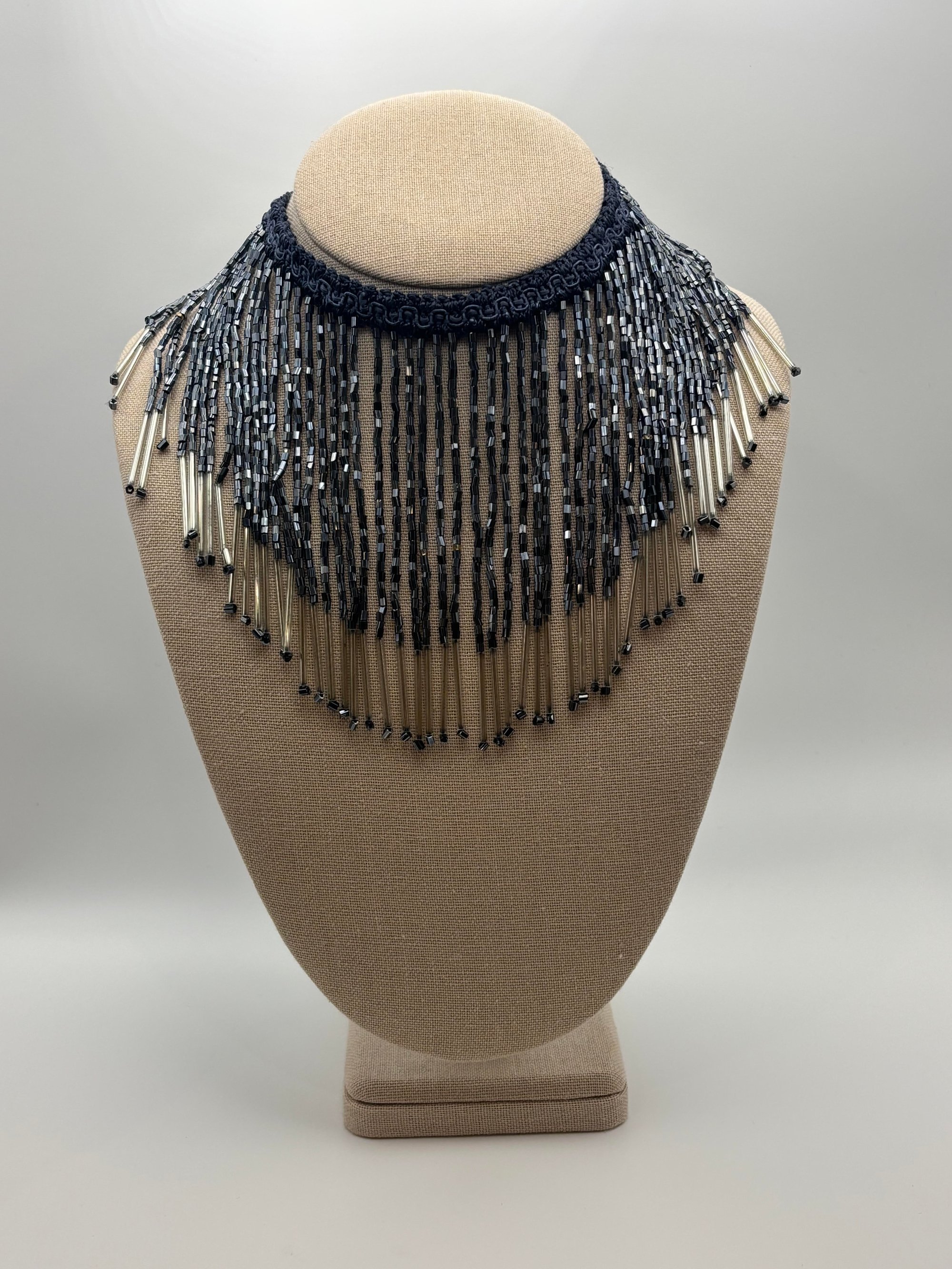 - Handmade beaded necklace with individually sewn glass beads in a cascading fringe shape