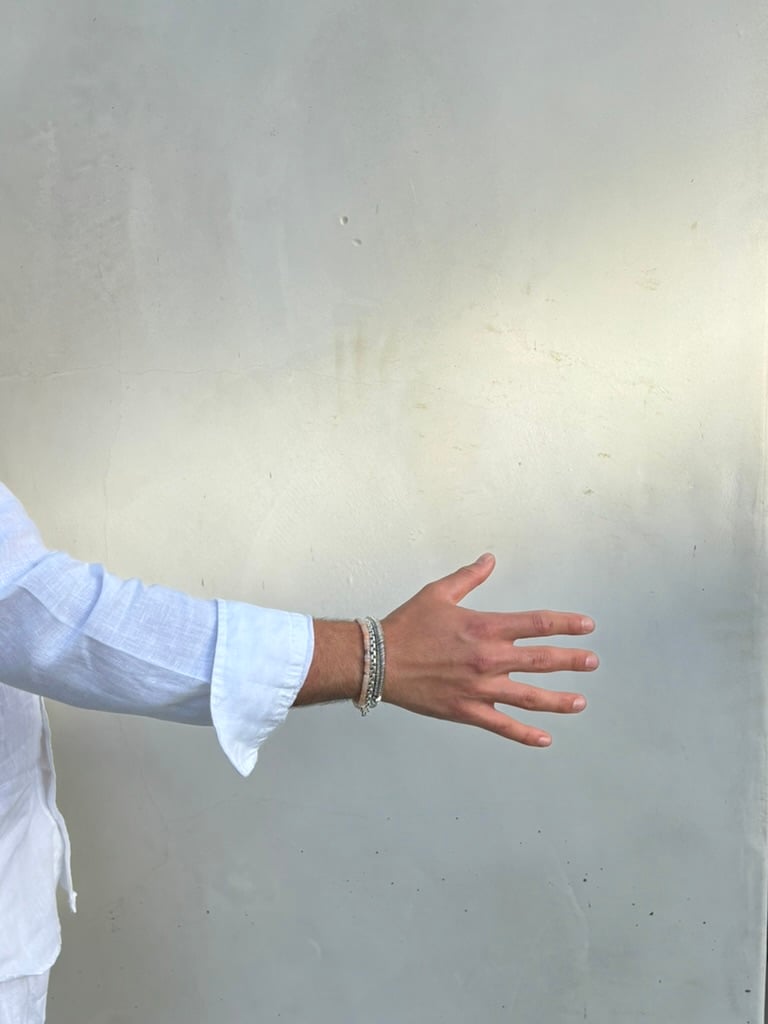Beaded bracelet in warm peach, tan, and beige tones with subtle silver accents